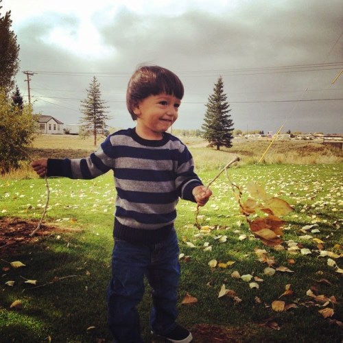 I marvel at this far more than I should. Growing up, I can remember digging holes in the yard at my Grandparents’ house, and pretending that my G.I. Joes were engaged in an intense guerrilla conflict. Clark is more interested in his iPad and Netflix options than in actually playing with the toys he has. And yet, when we take him to the park, as in the photo above, his eyes come alive with the magic of falling leaves, and small branches that are ripe for the picking. Every child has his treasures.