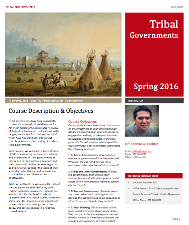 Toward that end, I’m teaching a course on Tribal Governments this semester (AIST 4100). The enrollment is relatively small with only seven intrepid students eager to take on the complexities of America’s fourth form of government.